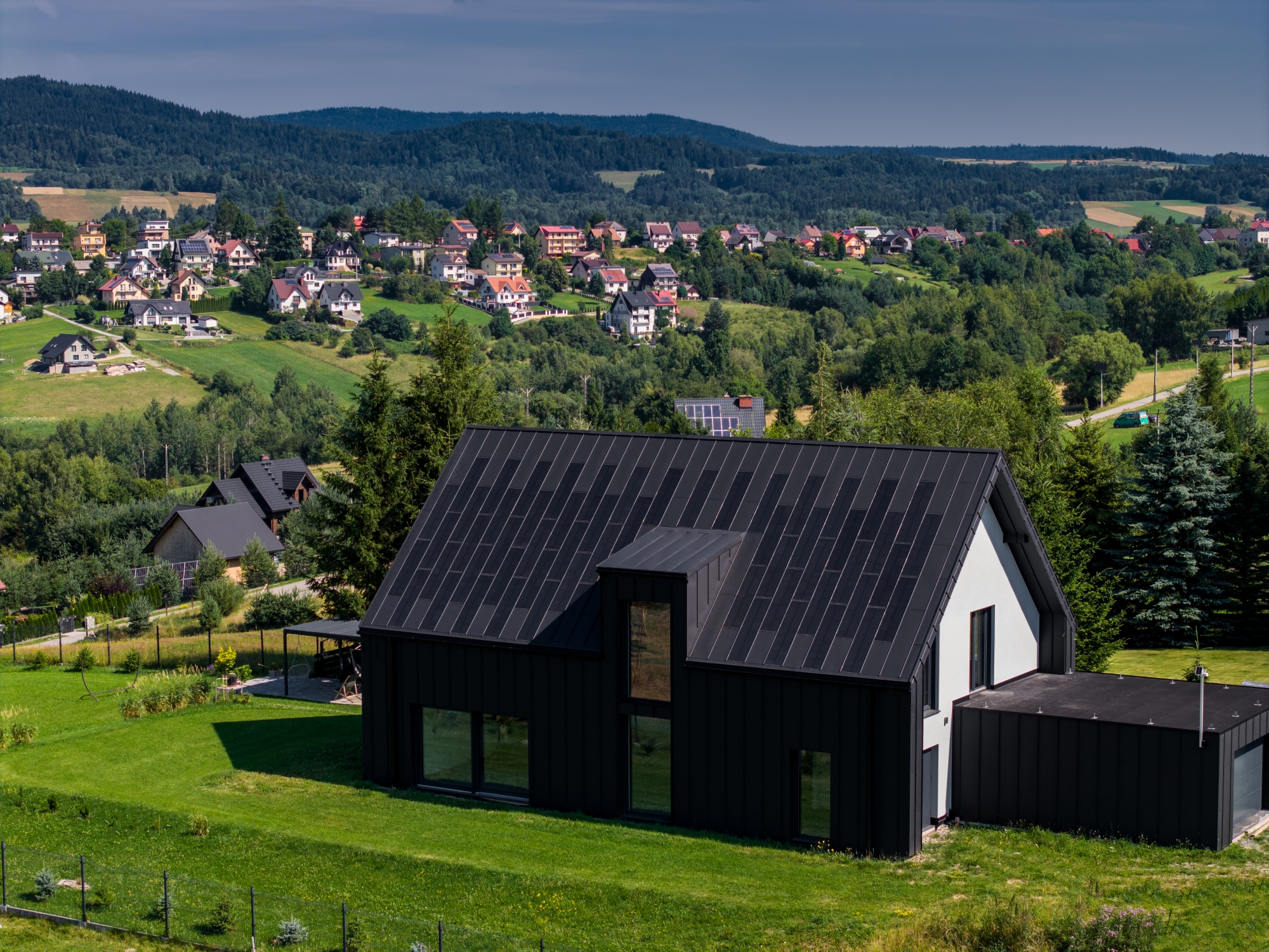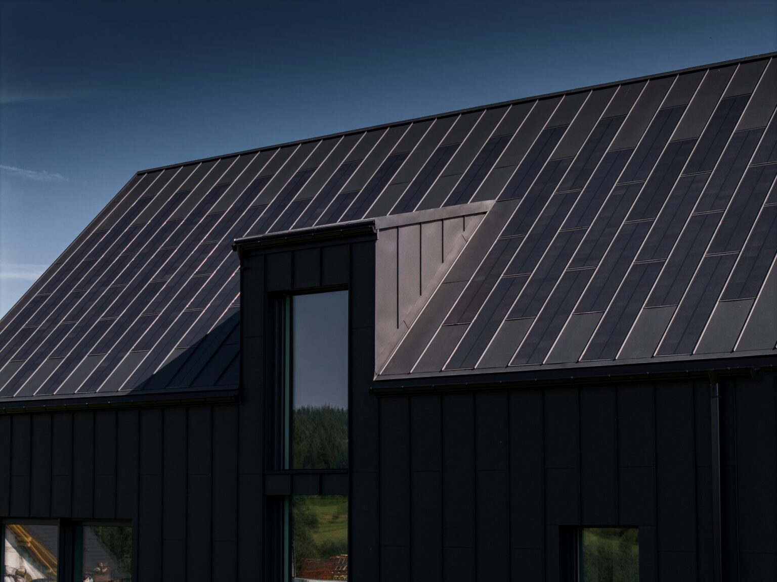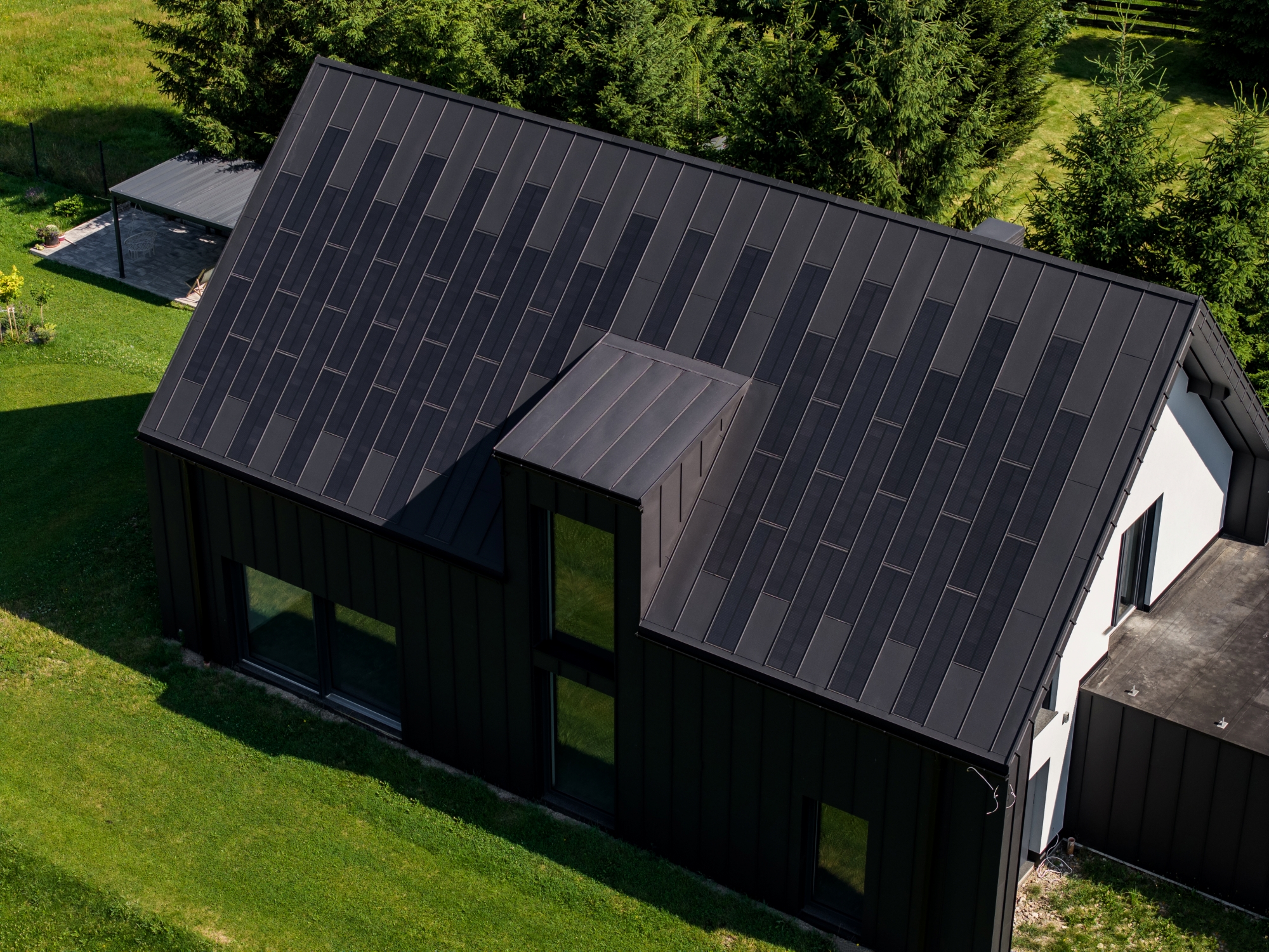 Na dachu zastosowano połączenie paneli fotowoltaicznych FIT VOLT oraz stalowych paneli uzupełniających FIT. Ten sam materiał znalazł się także na części elewacji – w kolorze głębokiej czerni, kontrastującej z białymi fragmentami ścian. Dzięki temu budynek zyskał spójny, surowy charakter.