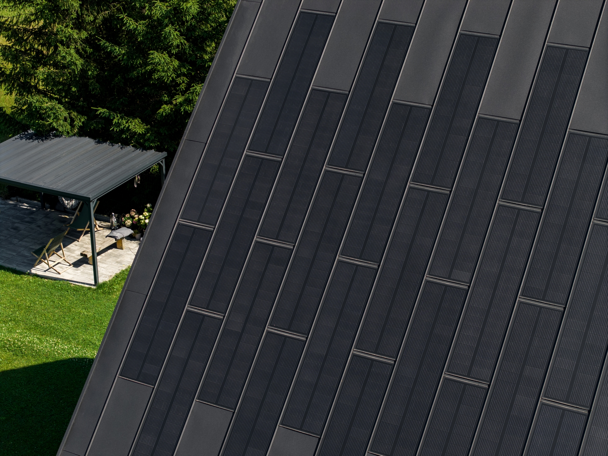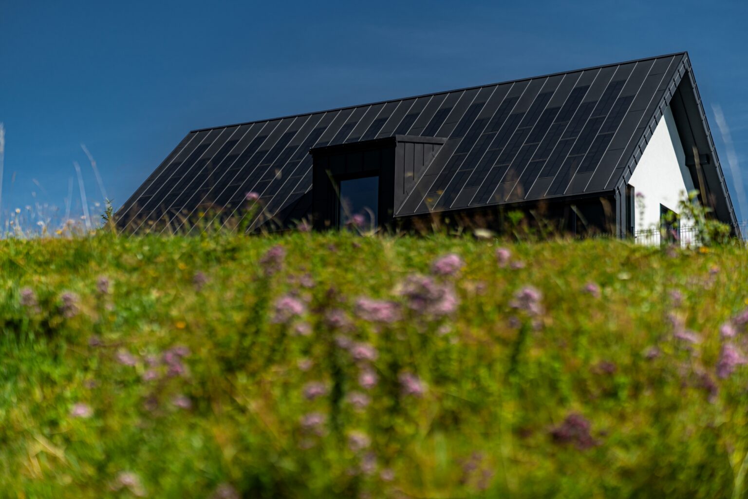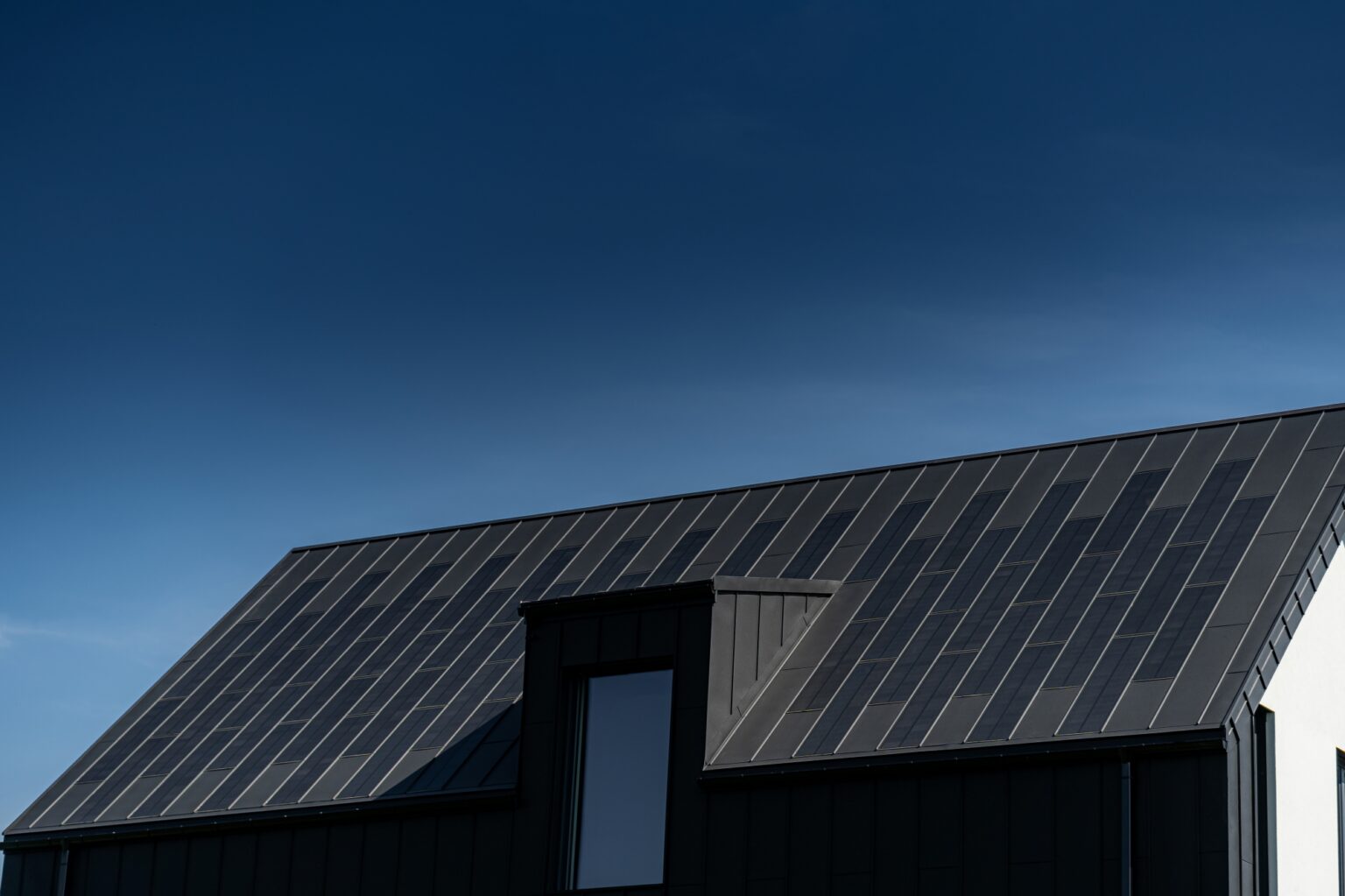 Na dachu zastosowano połączenie paneli fotowoltaicznych FIT VOLT oraz stalowych paneli uzupełniających FIT. Ten sam materiał znalazł się także na części elewacji – w kolorze głębokiej czerni, kontrastującej z białymi fragmentami ścian. Dzięki temu budynek zyskał spójny, surowy charakter.