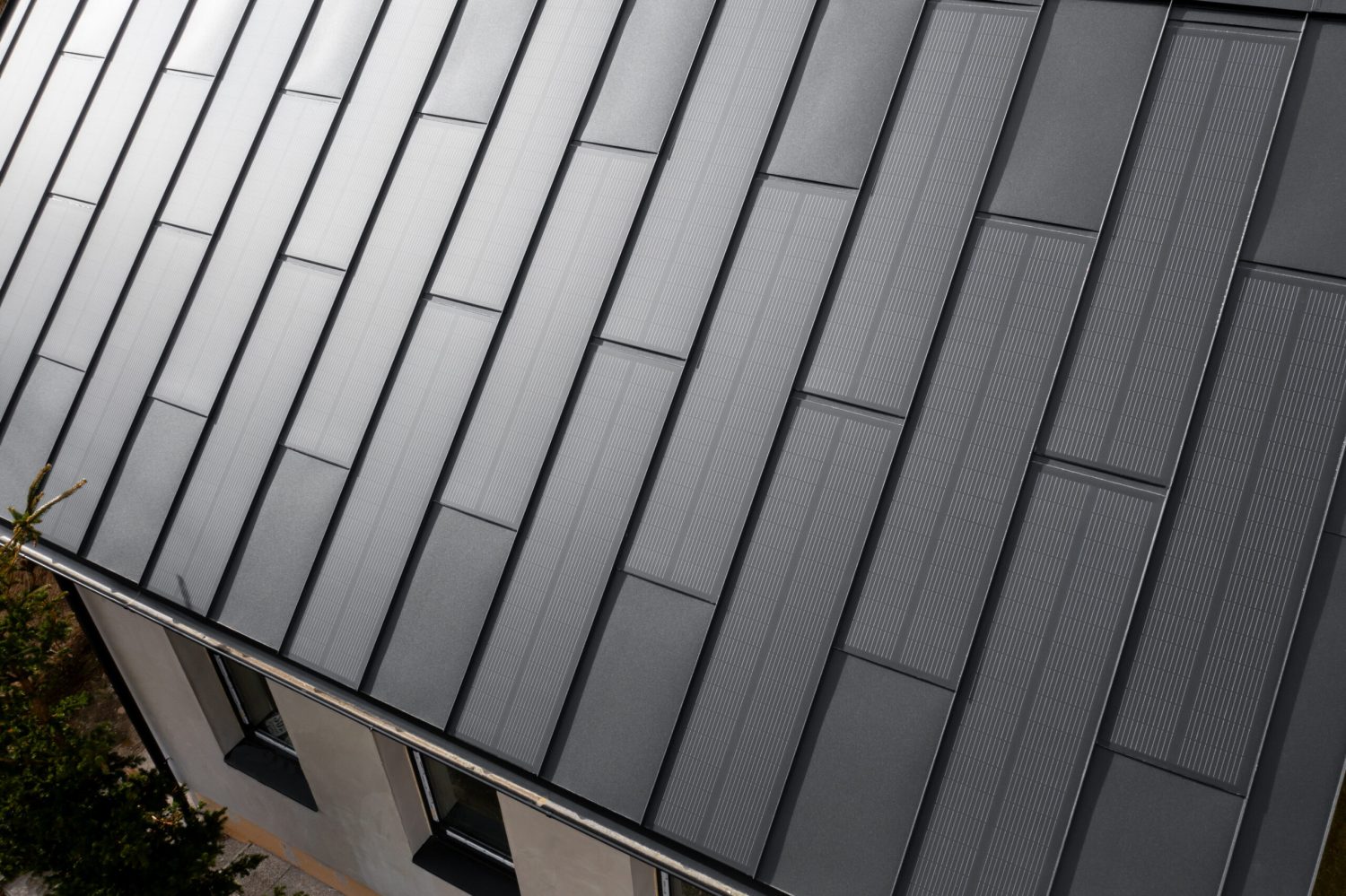 The client received a complete 2-in-1 roof from a single manufacturer, including installation and a single warranty for everything. In addition to active FIT VOLT and inactive FIT panels, the SOLROOF system was equipped with flashing, a steel gutter system, and photovoltaic installation components (optimizers and an inverter from SolarEdge).