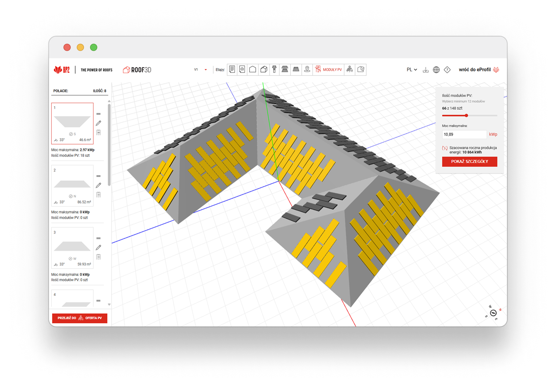 System rozmieszcza optymalne ułożenie paneli na modelu dachu 3D i daje możliwość dowolnego ustawienia mocy instalacji. Dzięki temu zyskujesz idealne dopasowanie przy minimalnym zużyciu materiału.