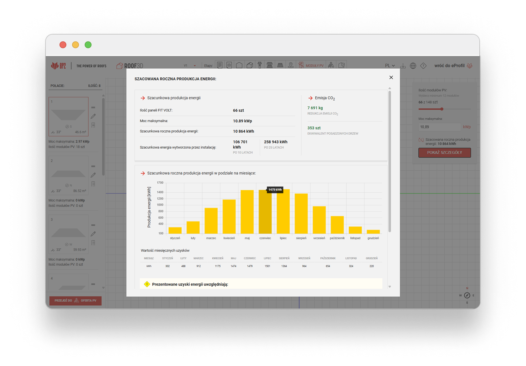 ROOF3D wykorzystuje zaawansowane narzędzia, które analizują m.in. nachylenie i orientację połaci dachowych oraz lokalizację budynku, aby precyzyjnie oszacować potencjalną produkcję energii. Warto pamiętać, że prognozy nie uwzględniają zacienienia ani zabrudzeń spowodowanych otoczeniem, jak drzewa, kominy czy sąsiednie budynki. Rzeczywista wydajność instalacji może się różnić w zależności od warunków lokalnych.