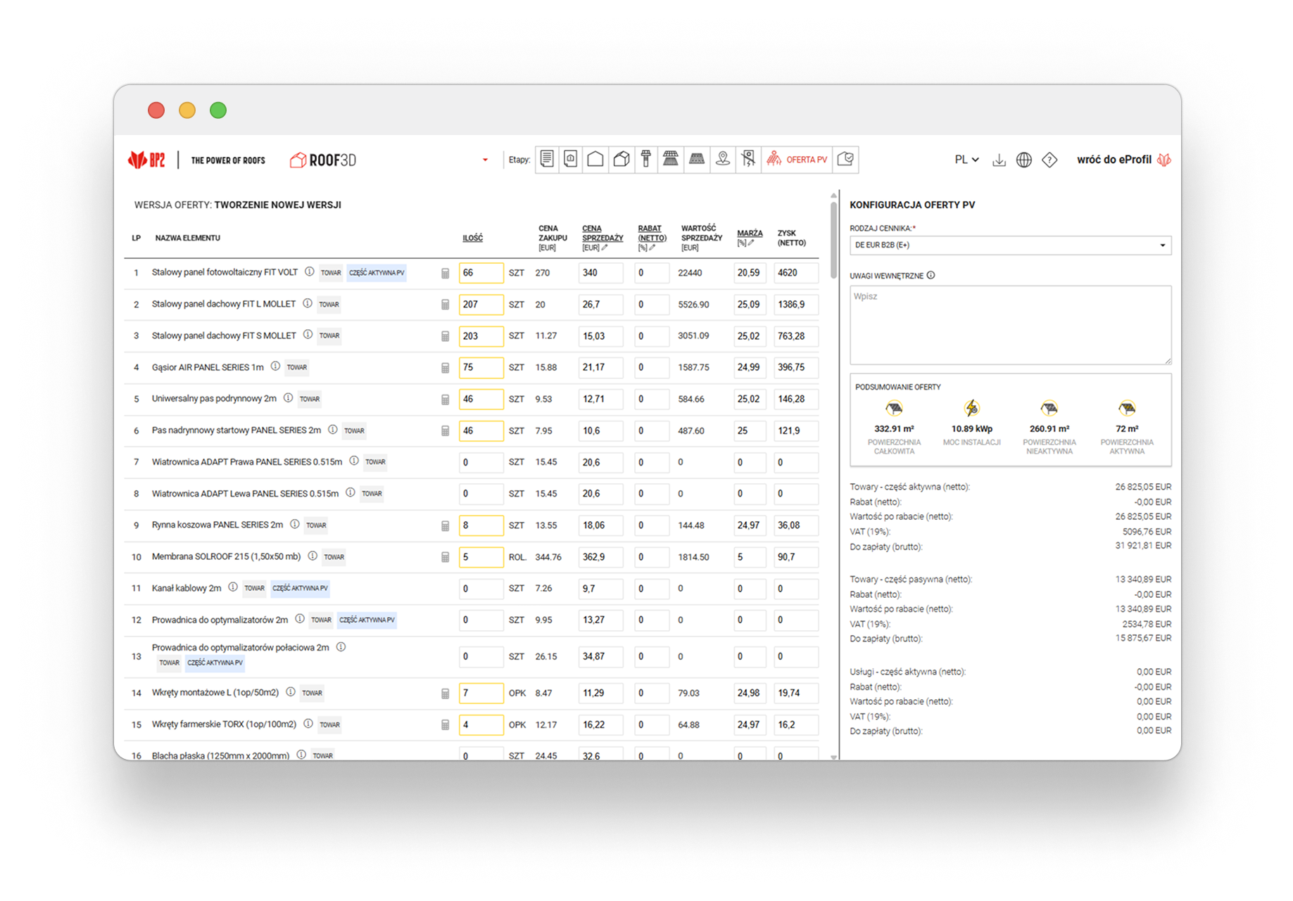 Na podstawie stworzonego projektu program ROOF3D automatycznie wygeneruje kompletną ofertę wraz z dokładną wyceną. Możesz w każdej chwili dostosować jej zawartość – modyfikować ceny, dodawać rabaty, ustalać własny zysk i marżę, a także zmieniać parametry techniczne projektu.