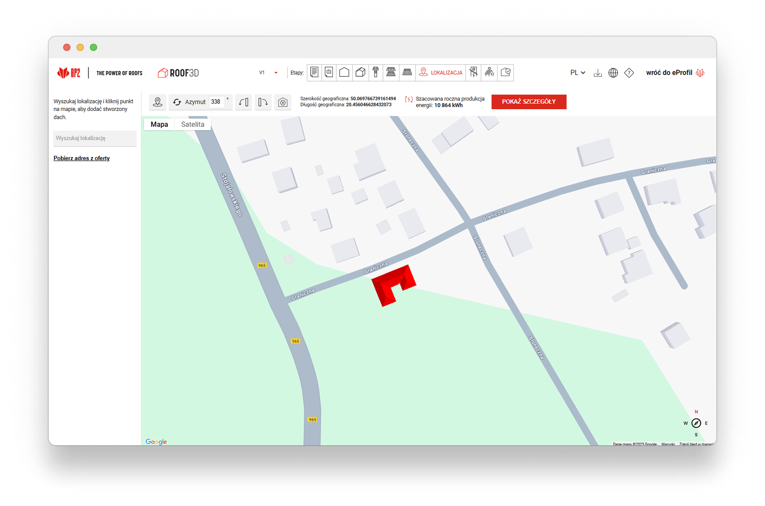 Proces tworzenia projektu dachu przebiega intuicyjnie w oparciu o model 3D. Wymiary, orientację osi dachu i dokładną lokalizację możesz wprowadzić za pomocą interaktywnej mapy Google.